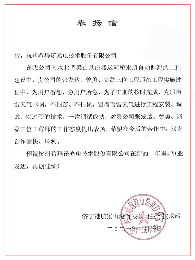 信中对我司张发达、曾勇、高磊三位工程师在南水北调梁山县庄楼运河桥水质自动监测站工程实施建设中,所展现出的专业素质、敬业态度、服务精神给予肯定和表扬。